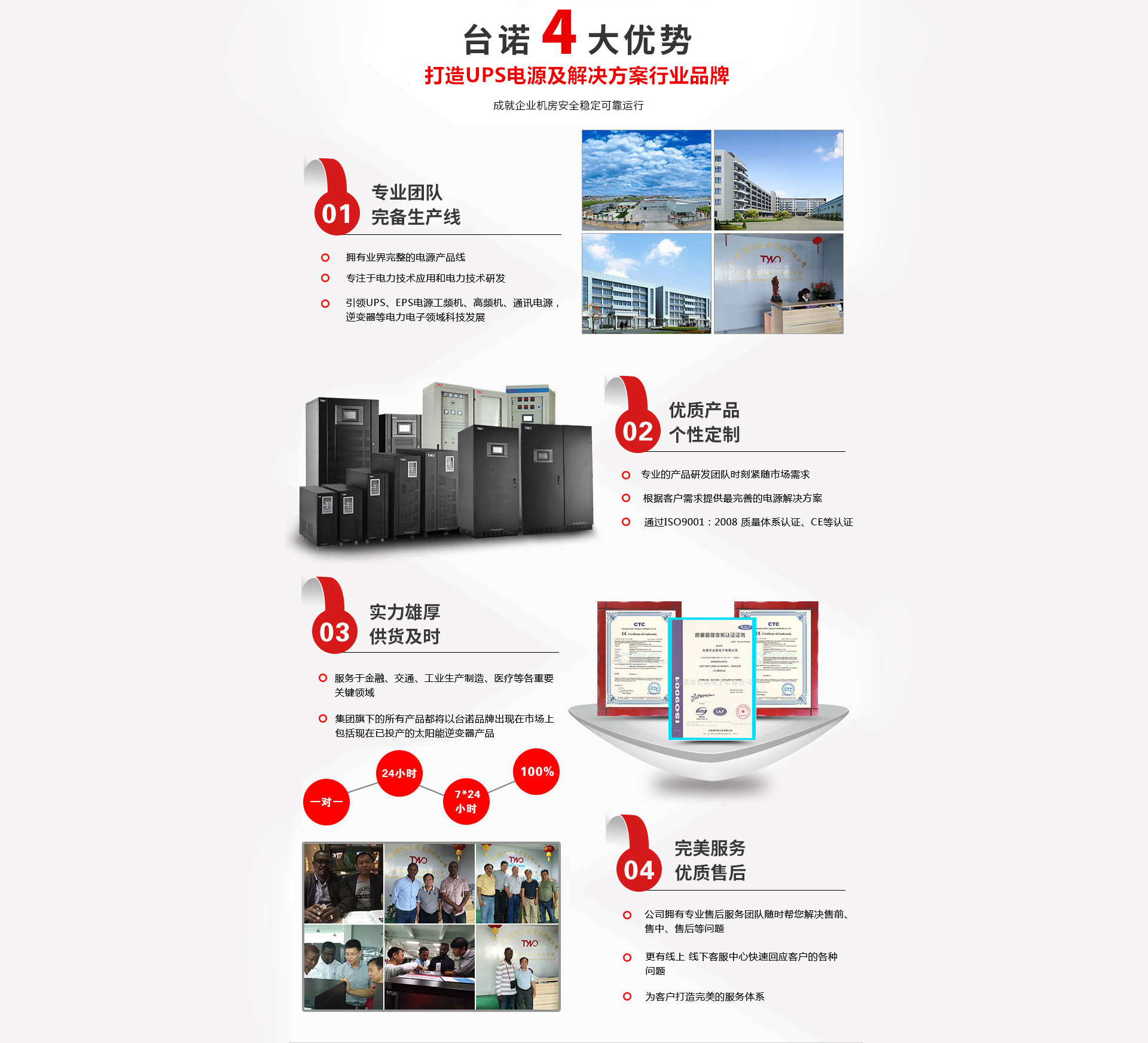 東莞市臺諾電子有限公司是一家以新能源、UPS不間斷電源、EPS應(yīng)急電源、交直流穩(wěn)壓電源、鉛酸免維護(hù)蓄電池、智能變頻電源、智能開關(guān)電源、智能一體化逆變電源、智能電源監(jiān)控系統(tǒng)的研究、開發(fā)、生產(chǎn)、經(jīng)營、銷售及技術(shù)推廣等多行業(yè)發(fā)展高新企業(yè)。公司位于東莞市毗鄰中國南方經(jīng)濟重地廣州、深圳,交通發(fā)達(dá),信息暢通。系廣東重點高新技術(shù)企業(yè)、東莞市創(chuàng)新型企業(yè)、也是中國電源協(xié)會、廣東省材料與器件產(chǎn)業(yè)技術(shù)創(chuàng)新戰(zhàn)略聯(lián)盟、 東莞市臺諾電子有限公司隸屬于臺諾集團,是一家有多年UPS集設(shè)計研發(fā)、生產(chǎn)銷售、售后服務(wù)為一體的公司,擁有業(yè)界完整的電源產(chǎn)品線,專注于電力技術(shù)應(yīng)用和電力技術(shù)研發(fā)。公司致力于向全球客戶提供性能好、品質(zhì)好的產(chǎn)品與服務(wù)。UPS、EPS電源工頻機、高頻機、通訊電源、光伏、逆變器等電力電子領(lǐng)域科技發(fā)展,創(chuàng)造可靠、節(jié)能的產(chǎn)品,致力于為客戶提供完善的電源解決方案。產(chǎn)品廣泛應(yīng)用于政府、金融、通信、教育、交通、氣象、廣播電視、工商...